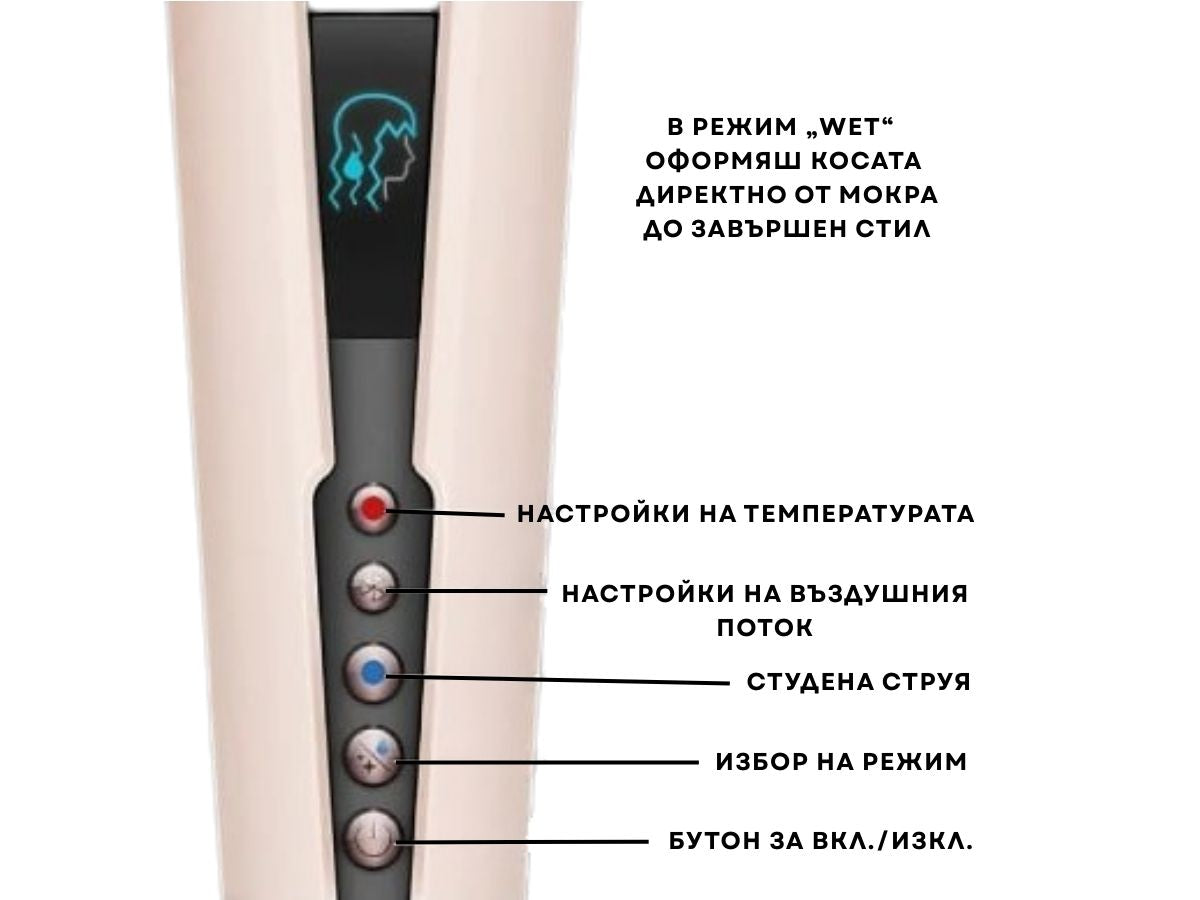 Вграденият LCD екран показва настройките за въздушен поток и температура, така че оформяш косата си прецизно и съобразено с нуждите ѝ.